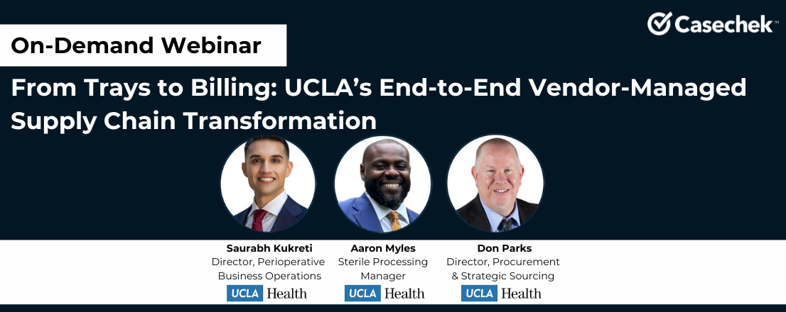 Watch to hear the inside story of how UCLA Health used Casechek’s Procurement and Payment solutions to overhaul the full lifecycle of vendor-managed supplies, from loaner trays to Bill-Onlys. Learn how cross-department alignment, workflow modernization, and data-driven vendor management helped eliminate bottlenecks, automate critical tasks, and improve billing accuracy.